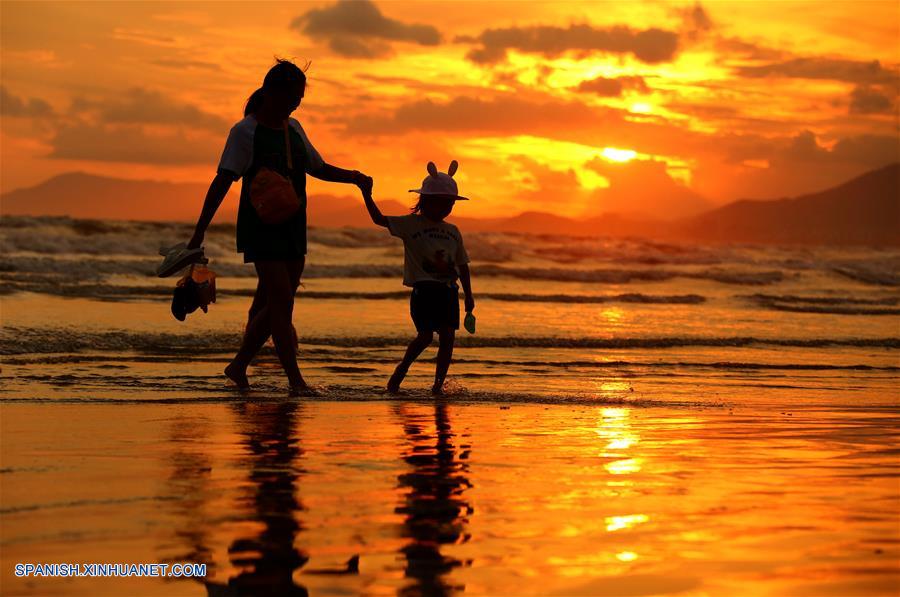 HAINAN, agosto 13, 2018 (Xinhua) -- Imagen del 12 de agosto de 2018 de personas jugando en la playa durante la puesta de sol en Sanya, provincia de Hainan, en el sur de China. (Xinhua/Chen Wenwu)