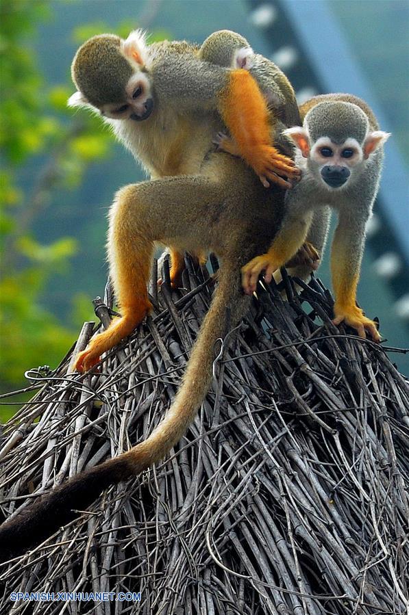 JIANGSU, agosto 13, 2018 (Xinhua) -- Monos ardilla se divierten en el Zoológico Forestal Shangfangshan, en Suzhou, provincia de Jiangsu, en el este de China, el 13 de agosto de 2018. (Xinhua/Hang Xingwei)