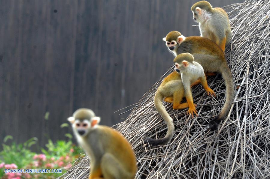 JIANGSU, agosto 13, 2018 (Xinhua) -- Monos ardilla se divierten en el Zoológico Forestal Shangfangshan, en Suzhou, provincia de Jiangsu, en el este de China, el 13 de agosto de 2018. (Xinhua/Hang Xingwei)