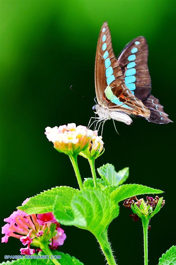 FUJIAN, agosto 13, 2018 (Xinhua) -- Imagen del 12 de agosto de 2018 de una mariposa parada en una flor lantana camara, en el Parque Wenquan en Fuzhou, capital de la provincia de Fujian, en el sureste de China. (Xinhua/Mei Yongcun)