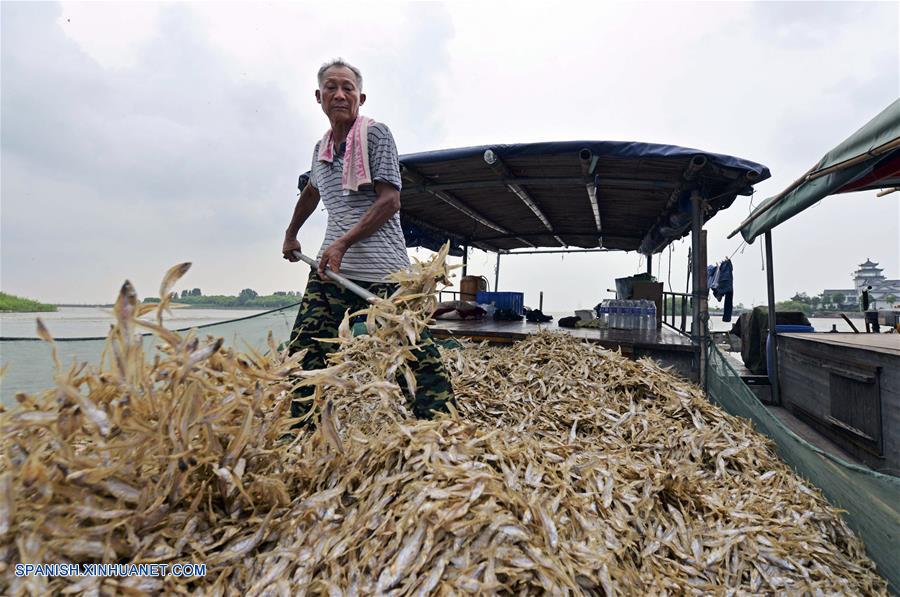 ANHUI, agosto 13, 2018 (Xinhua) -- Imagen del 12 de agosto de 2018 de un pescador embarcando anchoas en el área Lago Hongze de la ciudad de Huai'an, provincia de Anhui, en el este de China. (Xinhua/Chen Liang)