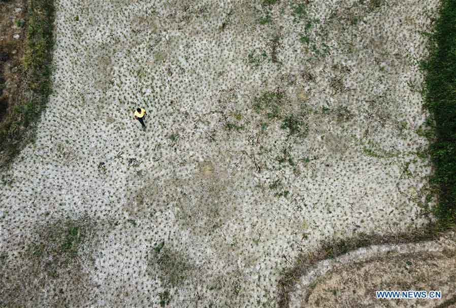 Un agricultor revisa un campo de arroz en la aldea Yinshan del municipio Liuli, en Jinxi, provincia de Jiangxi. Algunas zonas de la provincia de Jiangxi han sufrido una prolongada sequía debido al persistente calor del verano y a la ausencia de precipitaciones. 14 de agosto del 2018. (Foto: Xinhua/ Wan Xiang)