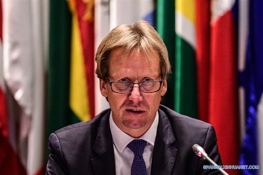 SANTIAGO, agosto 14, 2018 (Xinhua) -- El ministro Consejero y Encargado de Negocios a.i. de la República Federal de Alemania en Chile, Peter Sauer, participa durante la inauguración del seminario-taller: "Papel de las Defensorías del Pueblo en la promoción de una minería respetuosa con los derechos humanos y el medio ambiente", en la sede de la Comisión Económica para América Latina y el Caribe (CEPAL), en Santiago, capital de Chile, el 14 de agosto de 2018. Expertos se congregaron hoy en la sede de la Comisión Económica para América Latina y el Caribe (CEPAL) en Chile para advertir sobre la "finitud" de los recursos naturales no renovables y realizar un llamado a unificar "las buenas prácticas" en la región, en el marco de una "minería respetuosa". (Xinhua/Jorge Villegas)