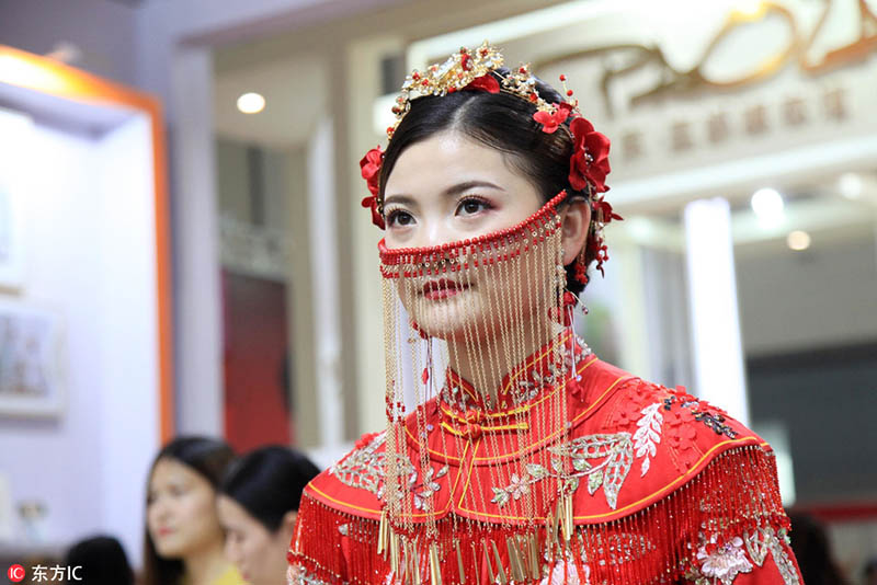 Una modelo se viste con un traje de boda chino tradicional en una exposición de bodas en Nanjing, provincia de Jiangsu, este de China, el 11 de agosto de 2018. [Foto / IC]