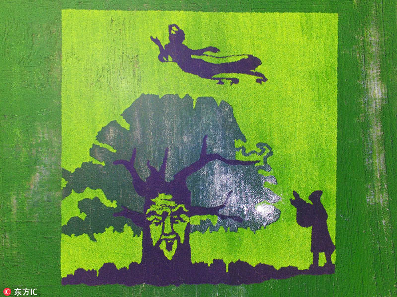 Un campo de arroz dise?ado con la trágica historia de amor entre Zhinv y Niulang en Yancheng, provincia de Jiangsu, este de China, el 7 de agosto de 2018. Según la tradición china, el Festival Qixi se celebra para recordar la leyenda de Zhinv y Niulang. [Foto / IC]