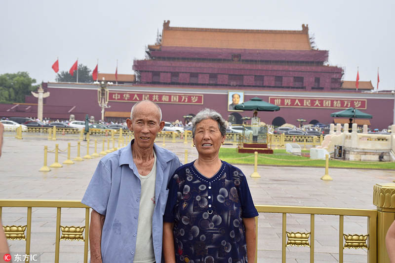 Una pareja se hace una foto juntos frente a la Plaza Tian'anmen antes del Día de San Valentín chino, o Festival Qixi, el 13 de agosto de 2018. [Foto / IC]