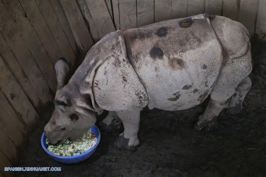 CHITWAN, agosto 14, 2018 (Xinhua) -- Imagen del archivo del 9 de julio de 2018 del rinoceronte de un cuerno llamado "Soaltee", que será obsequiado a China, alimentándose en su "Boma", un refugio especial dentro de las instalaciones del Parque Nacional de Chitwan, en Chitwan, Nepal. Nepal está listo para regalar otro par de bebés de rinoceronte de un cuerno llamados "Soaltee" y "Mitini" a China como parte del mejoramiento de la amistad entre los dos vecinos. Anteriormente, un par de rinocerontes había volado a China el 12 de julio de 2018. (Xinhua/Sunil Sharma)
