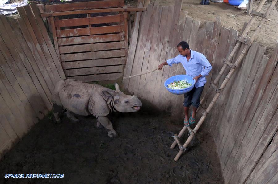 CHITWAN, agosto 14, 2018 (Xinhua) -- Imagen del archivo del 9 de julio de 2018 deun cuidador alimentando al rinoceronte de un cuerno llamado "Soaltee", que será obsequiado a China, en su "Boma", un refugio especial dentro de las instalaciones del Parque Nacional de Chitwan, en Chitwan, Nepal. Nepal está listo para regalar otro par de bebés de rinoceronte de un cuerno llamados "Soaltee" y "Mitini" a China como parte del mejoramiento de la amistad entre los dos vecinos. Anteriormente, un par de rinocerontes había volado a China el 12 de julio de 2018. (Xinhua/Sunil Sharma)
