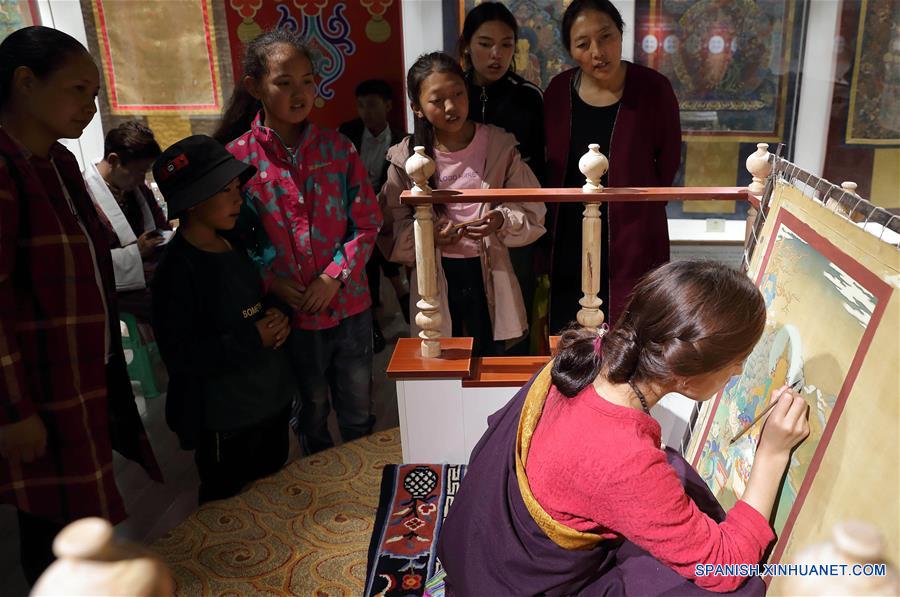 SICHUAN, agosto 18, 2018 (Xinhua) -- Imagen del 17 de agosto de 2018 de visitantes observando a una artista tibetana creando una pintura Tangka en un mercado sobre patrimonios cunturales intangibles, en el condado de Rangtang, provincia de Sichuan, en el suroeste de China. El mercado llamado Rangbala abrió al público el viernes en Rangtang, y exhibe y vende productos de 26 tipos de los patrimonios culturales intangibles locales. (Xinhua/Jiang Hongjing)