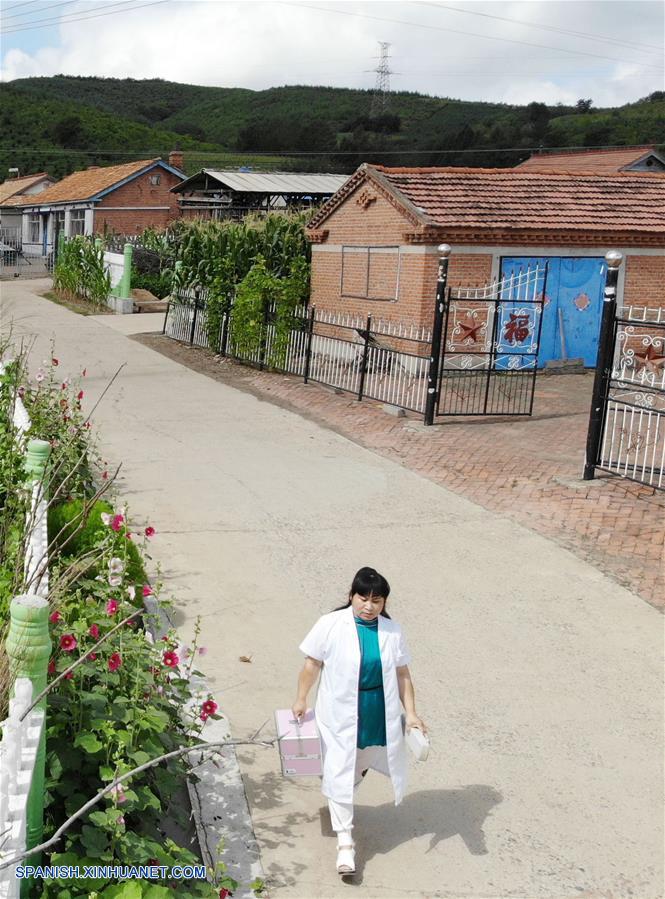 JILIN, agosto 17, 2018 (Xinhua) -- Imagen del 9 de agosto de 2018 de Yue Yanwei dirigiéndose a visitar a un paciente, en la villa de Qixin en la localidad de Gangyao de la ciudad de Jilin, provincia de Jilin, en el noreste de China. Yue, de 40 a?os de edad, ha sido doctora en la villa de Qixin durante 17 a?os desde su graduación de la escuela de medicida en 2001. Yue es el único médico en Qixin, donde viven unos 1,070 aldeanos. En opinion de Yue, la salud de todos importa, por lo que optó por permanecer en su puesto y se hizo cargo de los aldeanos. (Xinhua/Lin Hong)