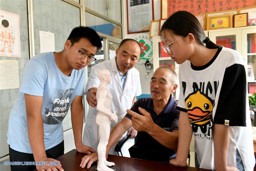 SHANDONG, agosto 17, 2018 (Xinhua) -- Imagen del 16 de agosto de 2018 del padre de Zhang Deqing, Zhang Zaiji (2-d) mostrando los puntos de acupuntura a Zhang Deqing y dos nietos, en la localidad de Yuandongtou del condado de Yishui, provincia de Shandong, en el este de China. Zhang ha sido médico de la villa de Yuandongtou de la localidad de Yuandongtou en Shandong durante 20 a?os. Su trabajo abarca a casi 2,000 aldeanos en tres villas de la localidad de Yuandongtou. Como muchos hogares están dispersos por las villas, Zhang tiene que escalar caminos monta?osos para visitar a los pacientes. Ahora hay cuatro generaciones de médicos en la familia de Zhang, incluidos el abuelo de Zhang, Zhang Daoli y el padre Zhang Zaiji. Los dos hijos de Zhang se graduaron de facultades de medicina en 2017, para convertirse en el cuarto Dr. Zhang en la ciudad. (Xinhua/Guo Xulei)