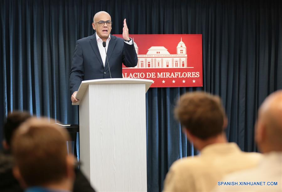 Imagen cedida por la Presidencia de Venezuela, del ministro venezolano de Comunicación, Jorge Rodríguez, participando durante una conferencia de prensa, en el Palacio de Miraflores, en Caracas, Venezuela, el 18 de agosto de 2018. El ministro venezolano de Comunicación, Jorge Rodríguez, anunció el sábado la apertura de 300 franquicias de casas de cambio en hoteles, aeropuertos y centros comerciales del país. (Xinhua/Presidencia de Venezuela)