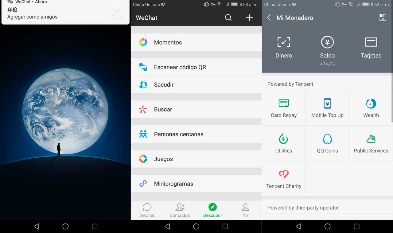 “WeChat se ocupa ya para todo, así como tiene su propio sistema de pago, Alipay y WeChat Payment son los dos… prácticamente en WeChat haces todos los pagos, todas las transferencias, te registras ante la policía, haces el pago de visa, todo. Yo la llamo más bien la puerta virtual, en la que tú estás de un lado a otro, de tanto la realidad como lo virtual”, considera Eduardo Rivero, quien vive en Guangzhou y lleva 12 a?os en China.