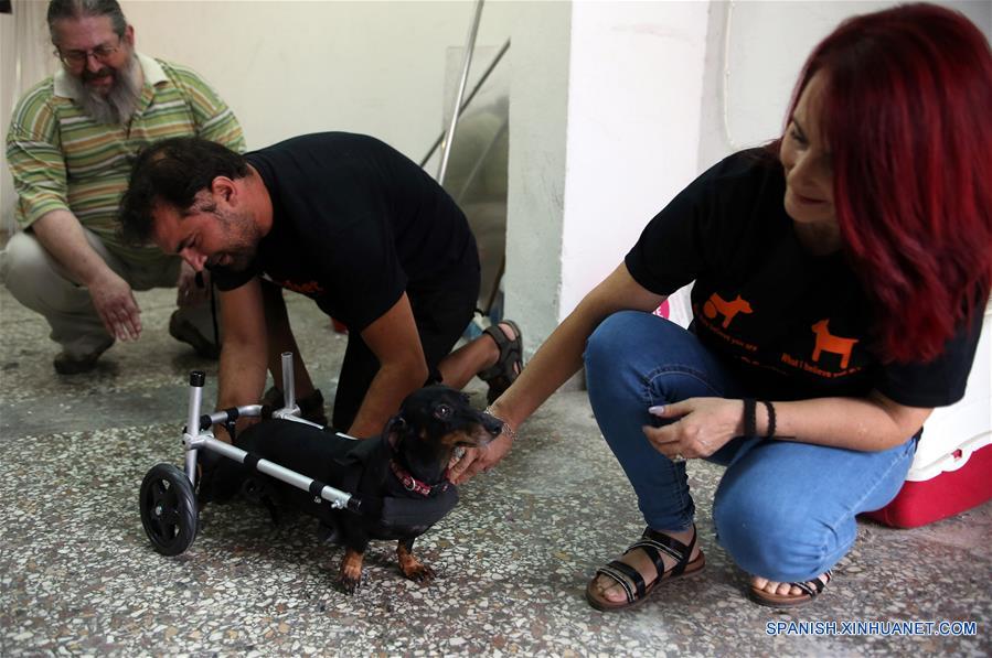 Imagen del 17 de agosto de 2018 de una vista de un perro con sus patas traseras unidas con una mini silla de ruedas en Atenas, Grecia. (Xinhua/Marios Lolos)