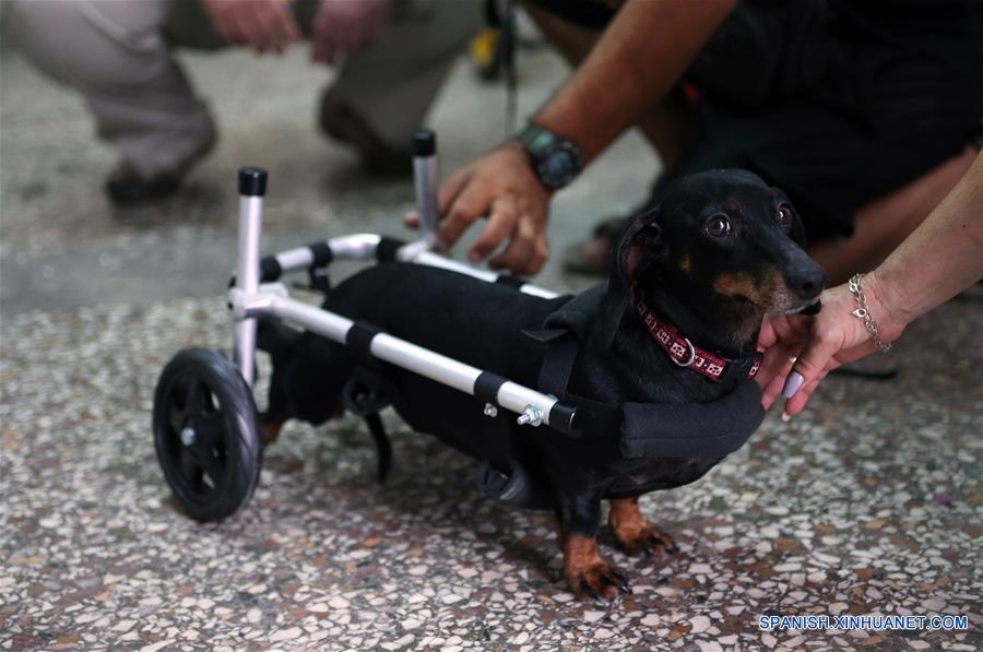Imagen del 17 de agosto de 2018 de una vista de un perro con sus patas traseras unidas con una mini silla de ruedas en Atenas, Grecia. (Xinhua/Marios Lolos)