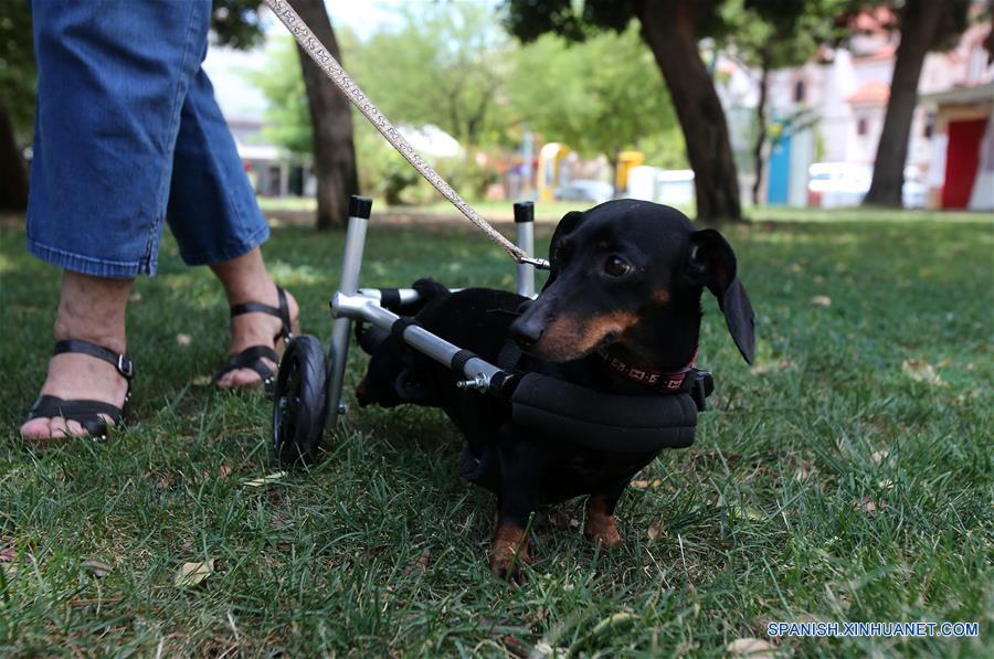 ATENAS, agosto 18, 2018 (Xinhua) -- Imagen del 17 de agosto de 2018 de una vista de un perro con sus patas traseras unidas con una mini silla de ruedas en Atenas, Grecia. (Xinhua/Marios Lolos)