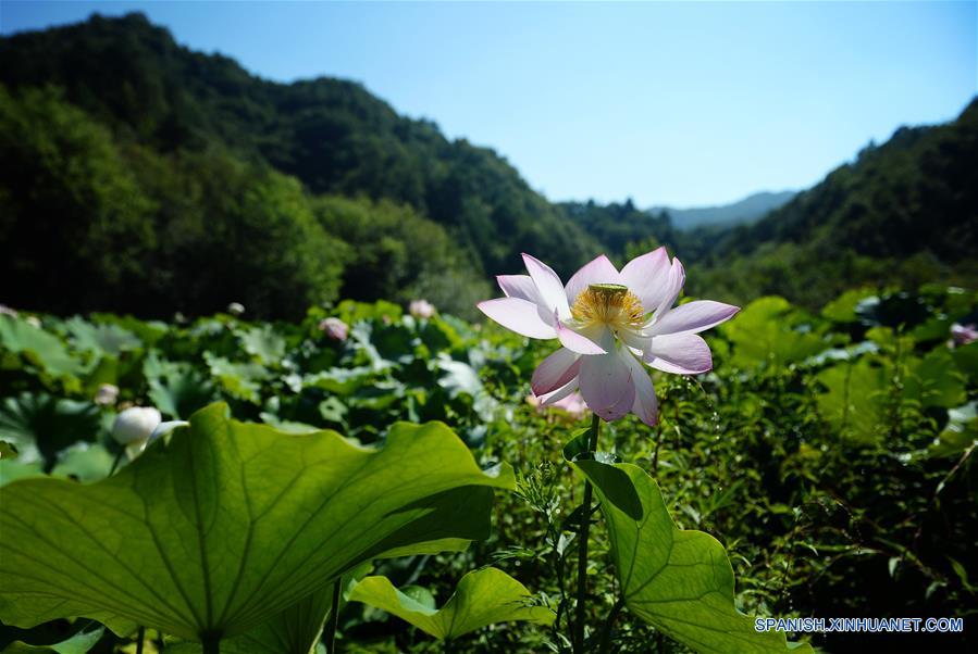 SHAANXI, agosto 19, 2018 (Xinhua) -- Flores de loto permanecen en un punto escénico en las Monta?as Qinling, en la provincia de Shaanxi, en el noroeste de China, el 19 de agosto de 2018. (Xinhua/Liu Xiao)