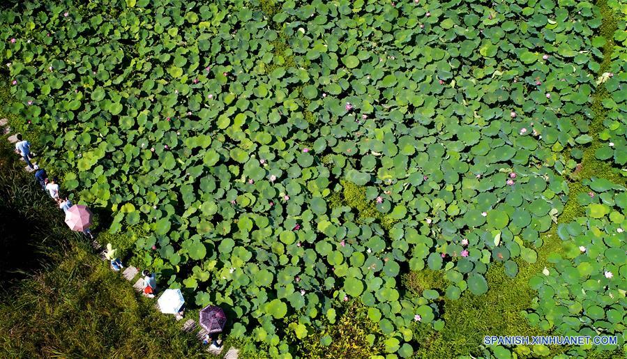 SHAANXI, agosto 19, 2018 (Xinhua) -- Vista aérea de turistas observando flores de loto en un punto escénico en las Monta?as Qinling, en la provincia de Shaanxi, en el noroeste de China, el 19 de agosto de 2018. (Xinhua/Liu Xiao)