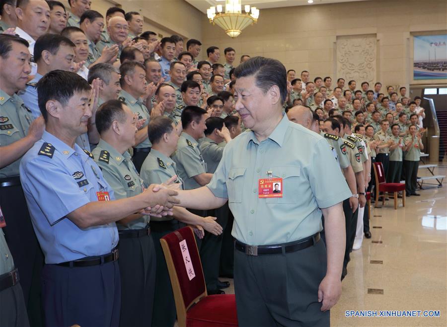 El presidente de China, Xi Jinping, también secretario general del Comité Central del Partido Comunista de China (PCCh) y presidente de la Comisión Militar Central (CMC), se reúne con delegados que asisten a una reunión de la CMC sobre la construcción del Partido en Beijing, capital de China. Xi Jinping asistió a la reunión, que se llevó a cabo del 17 al 19 de agosto de 2018. (Xinhua/Li Gang)