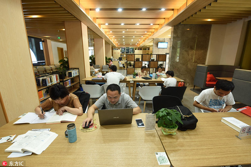 La gente lee libros en la Biblioteca Lago Oeste, una biblioteca de autoservicio en Hangzhou, capital de la provincia oriental de Zhejiang, el 20 de agosto de 2018. [Foto / IC]