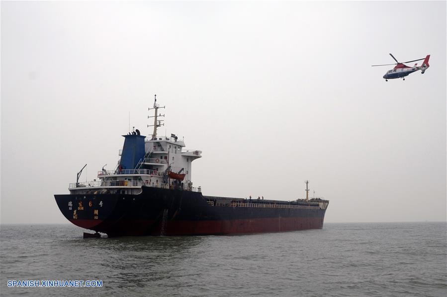 HEBEI, agosto 21, 2018 (Xinhua) -- Un helicóptero de rescate (d) se aproxima a una "escena de emergencia" durante un simulacro de emergencia marítima llevado a cabo cerca del Puerto de Huanghua en Cangzhou, provincia de Hebei, en el norte de China, el 21 de agosto de 2018. Las administraciones de seguridad marítima de Hebei, Tianjin y Shandong llevaron a cabo el martes un simulacro de emergencia conjunto en el oeste del mar de Bohai para mejorar la búsqueda y rescate en el mar así como la respuesta a derrames de petróleo. (Xinhua/Ma Ning)