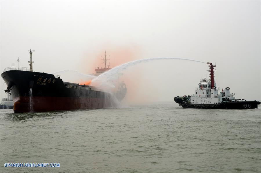 HEBEI, agosto 21, 2018 (Xinhua) -- Un bote de rescate (d) apaga un "incendio" que ocurre en un buque durante un simulacro de emergencia marítima llevado a cabo cerca del Puerto de Huanghua en Cangzhou, provincia de Hebei, en el norte de China, el 21 de agosto de 2018. Las administraciones de seguridad marítima de Hebei, Tianjin y Shandong llevaron a cabo el martes un simulacro de emergencia conjunto en el oeste del mar de Bohai para mejorar la búsqueda y rescate en el mar así como la respuesta a derrames de petróleo. (Xinhua/Ma Ning)