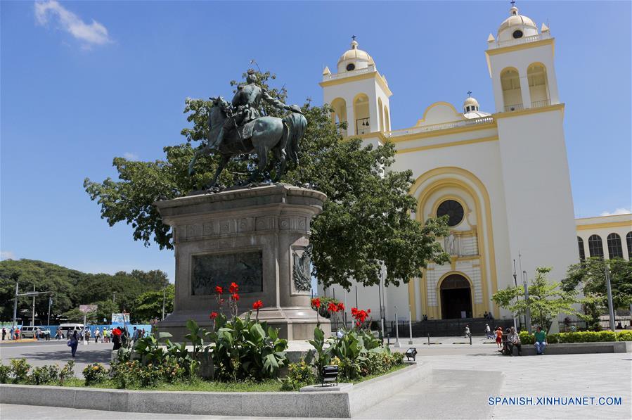 Vista de la fachada de la Catedral Metropolitana de San Salvador, desde la Plaza Gerardo Barrios, en el centro histórico de San Salvador, El Salvador, el 21 de agosto de 2018. La República Popular China y la República de El Salvador firmaron el martes en Beijing un comunicado conjunto sobre el establecimiento de relaciones diplomáticas. El comunicado fue firmado por el consejero de Estado y ministro de Relaciones Exteriores chino, Wang Yi, y el ministro de Relaciones Exteriores salvadore?o, Carlos Castaneda. (Xinhua/Alexander Pe?a)