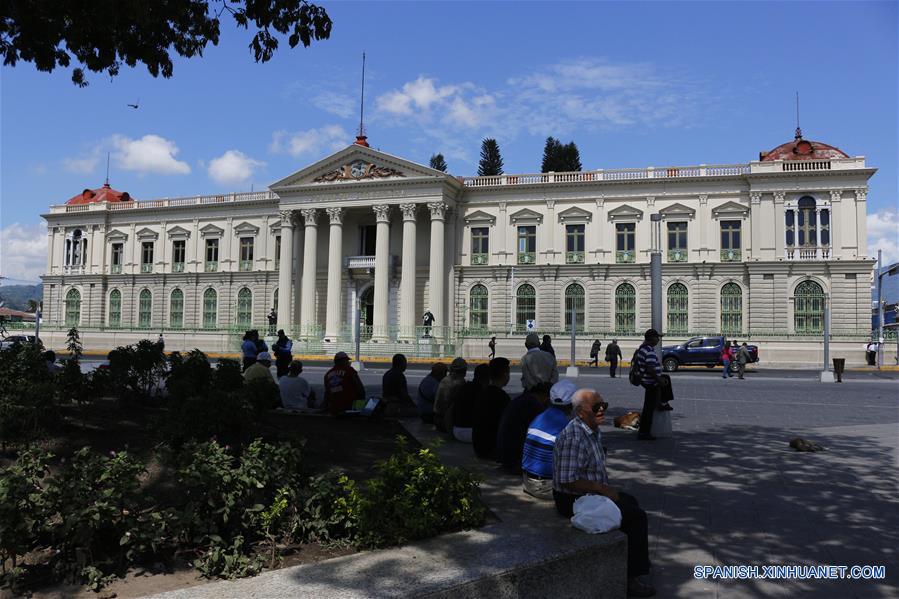 Personas toman un descanso frente al Palacio Nacional de El Salvador, en el centro histórico de San Salvador, capital de El Salvador, el 21 de agosto de 2018. La República Popular China y la República de El Salvador firmaron el martes en Beijing un comunicado conjunto sobre el establecimiento de relaciones diplomáticas. El comunicado fue firmado por el consejero de Estado y ministro de Relaciones Exteriores chino, Wang Yi, y el ministro de Relaciones Exteriores salvadore?o, Carlos Castaneda. (Xinhua/Alexander Pe?a)