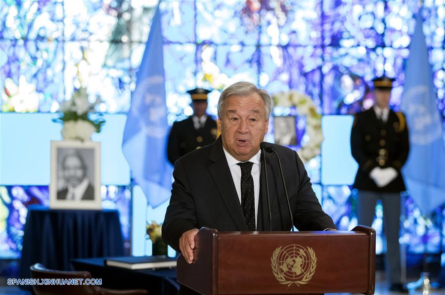 NUEVA YORK, agosto 22, 2018 (Xinhua) -- El secretario general de la Organización de las Naciones Unidas (ONU), Antonio Guterres, pronuncia sus comentarios después de firmar un libro de condolencias en memoria del fallecido ex secretario general de la ONU, Kofi Annan, en la sede de la ONU en Nueva York, Estados Unidos, el 22 de agosto de 2018. Una ceremonia de colocación de ofrenda floral fue llevada a cabo el miércoles en la sede de la ONU en Nueva York para llevar el luto por la muerte del ex secretario general de la ONU, Kofi Annan. Annan, un diplomático ghanés, falleció el sábado en Suiza. Sirvió como secretario general de la ONU durante 10 a?os. (Xinhua/Li Muzi)