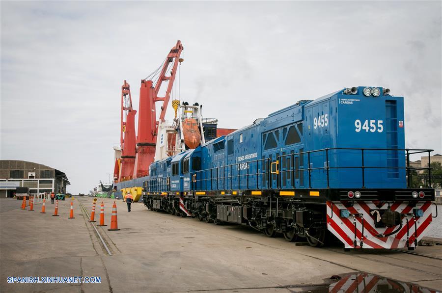 BUENOS AIRES, agosto 22, 2018 (Xinhua) -- Imagen del 10 de julio de 2018 cedida por el Ministerio de Transporte de Argentina, de una locomotora de fabricación china siendo descargada en el puerto de Buenos Aires, Argentina. Autoridades argentinas han resaltado la recuperación y la importancia para la economía del país de la línea de trenes Belgrano Cargas, iniciativa en la cual la nación sudamericana cuenta con la cooperación y apoyo de China. El tren Belgrano Cargas, que une las provincias del norte con los puertos del Gran Rosario, polo agroexportador ubicado en el litoral este del país, ya tiene más de 500 kilómetros de vía renovados, tras un a?o y medio de obras. El tren Belgrano Cargas es operado por la empresa estatal Trenes Argentinos Cargas (TAC), dependiente del Ministerio de Transporte. (Xinhua/Ministerio de Transporte de Argentina)