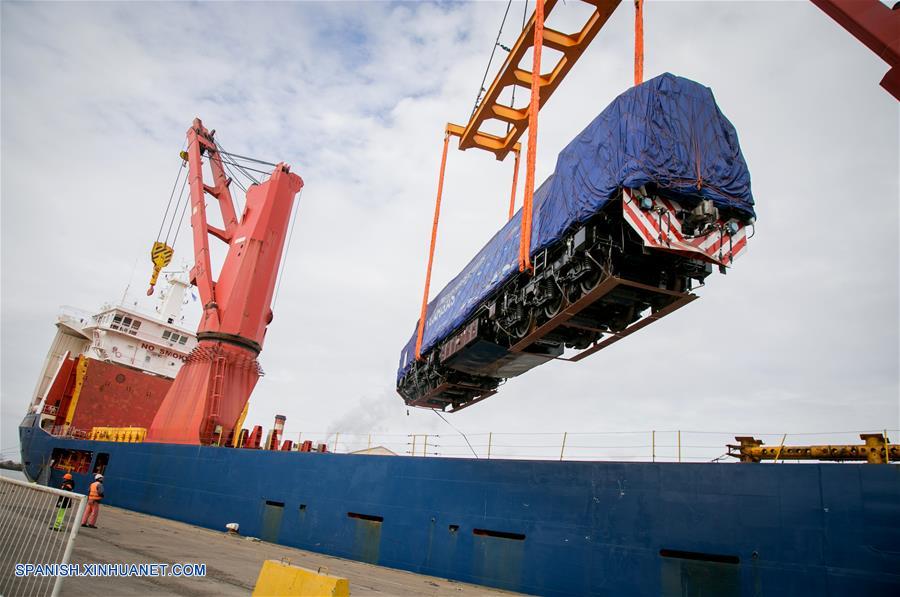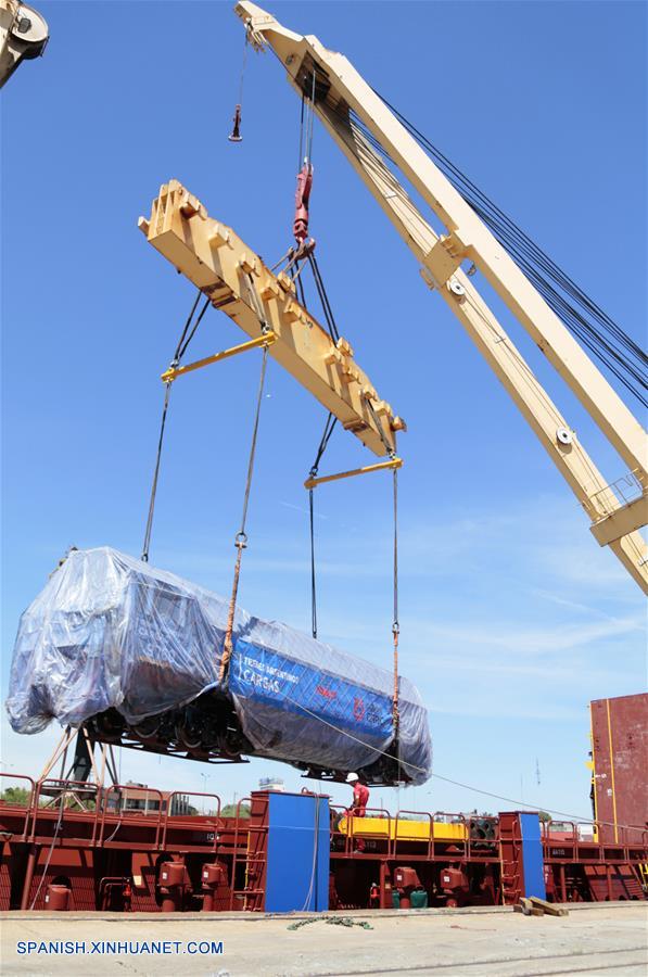 BUENOS AIRES, agosto 22, 2018 (Xinhua) -- Imagen del 10 de julio de 2018 cedida por el Ministerio de Transporte de Argentina, de un vagón de tren de fabricación china siendo descargado en el puerto de Buenos Aires, Argentina. Autoridades argentinas han resaltado la recuperación y la importancia para la economía del país de la línea de trenes Belgrano Cargas, iniciativa en la cual la nación sudamericana cuenta con la cooperación y apoyo de China. El tren Belgrano Cargas, que une las provincias del norte con los puertos del Gran Rosario, polo agroexportador ubicado en el litoral este del país, ya tiene más de 500 kilómetros de vía renovados, tras un a?o y medio de obras. El tren Belgrano Cargas es operado por la empresa estatal Trenes Argentinos Cargas (TAC), dependiente del Ministerio de Transporte. (Xinhua/Ministerio de Transporte de Argentina)