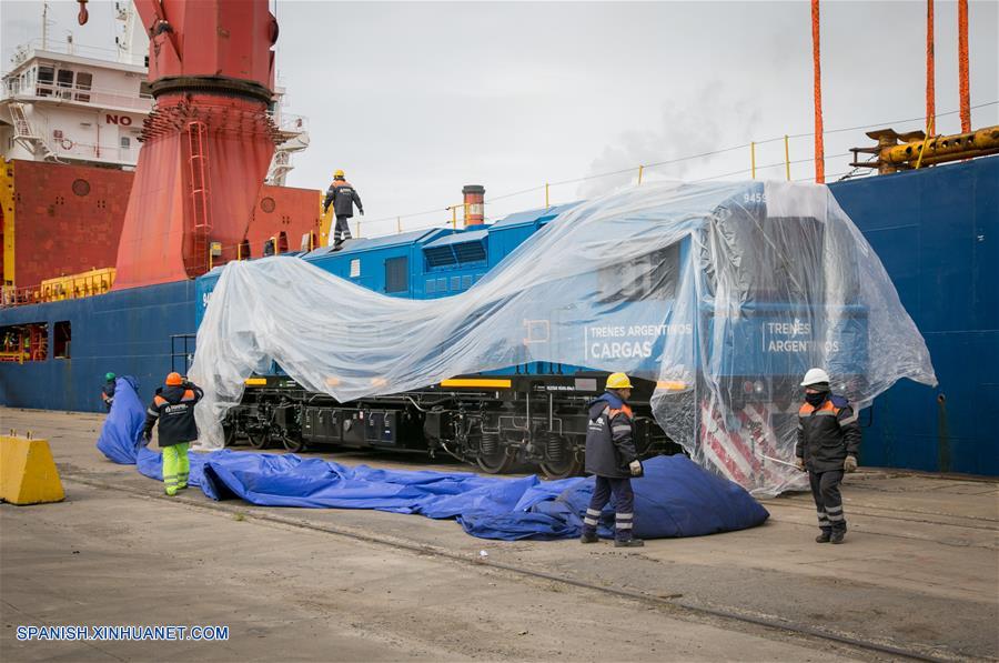BUENOS AIRES, agosto 22, 2018 (Xinhua) -- Imagen del 10 de julio de 2018 cedida por el Ministerio de Transporte de Argentina, de trabajadores descargando una locomotora de fabricación china en el puerto de Buenos Aires, Argentina. Autoridades argentinas han resaltado la recuperación y la importancia para la economía del país de la línea de trenes Belgrano Cargas, iniciativa en la cual la nación sudamericana cuenta con la cooperación y apoyo de China. El tren Belgrano Cargas, que une las provincias del norte con los puertos del Gran Rosario, polo agroexportador ubicado en el litoral este del país, ya tiene más de 500 kilómetros de vía renovados, tras un a?o y medio de obras. El tren Belgrano Cargas es operado por la empresa estatal Trenes Argentinos Cargas (TAC), dependiente del Ministerio de Transporte. (Xinhua/Ministerio de Transporte de Argentina)