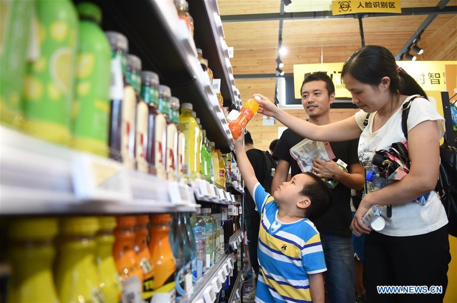Los visitantes compran productos dentro de la ciudad inteligente de la primera edición de la Exposición China Inteligente inaugurada en Chongqing. La ciudad inteligente, una zona especial de exhibición que ocupa 30.000 metros cuadrados, abrió al público este jueves para mostrar la vida cotidiana asistida por la tecnología de punta. La muestra estará abierta durante todo un a?o. 23 de agosto del 2018. (Foto: Xinhua/ Tang Yi)