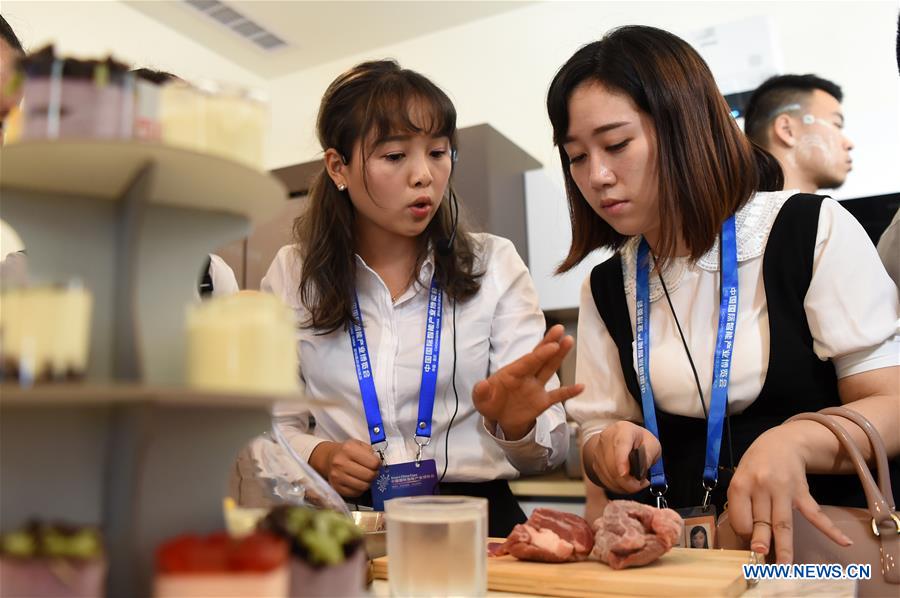 Un miembro del personal (i) presenta la tecnología inteligente para la cocina a una visitante en una ciudad inteligente de la primera Expo Smart China en el suroeste de la China de Chongqing municipio, 23 de agosto, 2018. La ciudad inteligente, una zona especial de exhibición de Smart China Expo que cubre un área de 30.000 metros cuadrados, estaba abierta al público el jueves. La ciudad muestra la vida en el futuro con tecnología inteligente para los visitantes, y continuará su operación durante un a?o. (Xinhua/Tang Yi)
