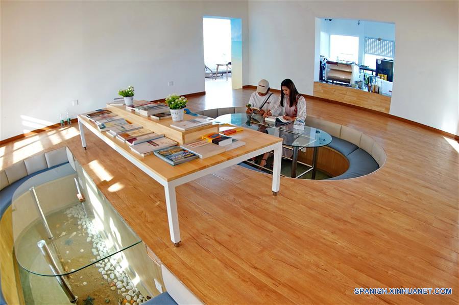HEBEI, agosto 25, 2018 (Xinhua) -- Turistas leen en un bar de libros, en un punto escénico en Beidaihe, provincia de Hebei, en el norte de China, el 25 de agosto de 2018. Los bares de libros fueron establecidos en muchos puntos escénicos en Beidaihe para los turistas. (Xinhua/Yang Shiyao)