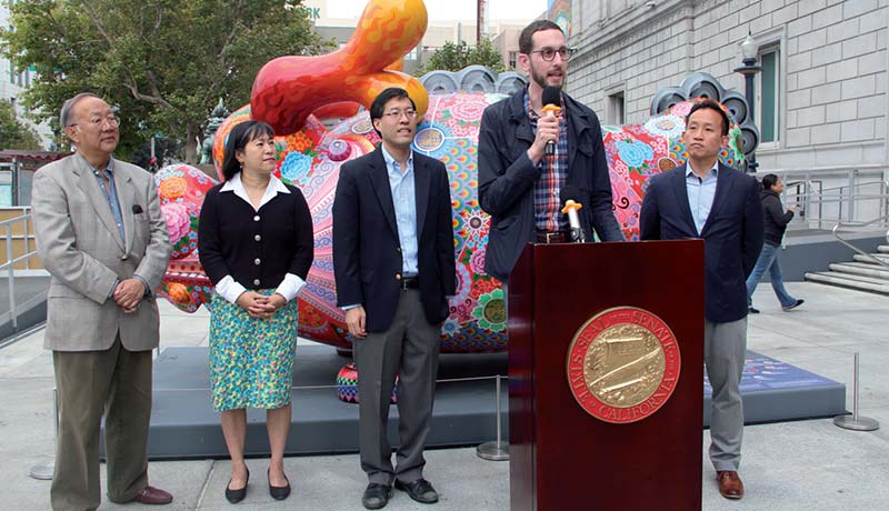 La senadora de California Scott Wiener (segunda a la derecha), se une a otros funcionarios electos del Estado y a miembros de la comunidad para anunciar que el gobernador Jerry Brown firmó el proyecto de ley 892 del Senado, que reconoce oficialmente el a?o nuevo lunar en California, San Francisco. (Foto: Lia Zhu/China Daily)