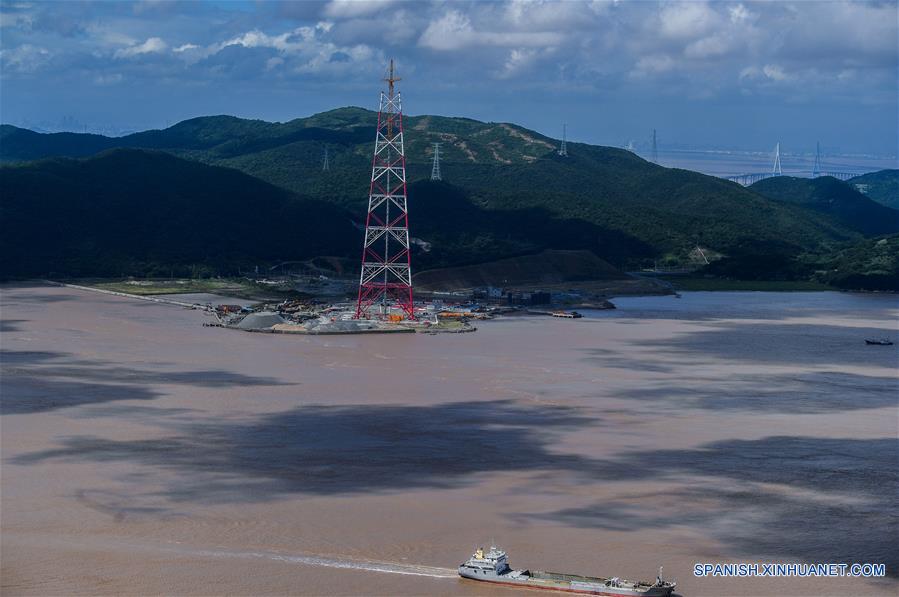 ZHEJIANG, agosto 28, 2018 (Xinhua) -- Vista de una torre gigante de suministro de energía en construcción en la isla Jintang de Zhoushan, provincia de Zhejiang, en el este de China, el 28 de agosto de 2018. A una impresionante altura de 380 metros, las dos torres llevarán los cables de alimentación entre las islas Jintang y Cezi de Zhoushan, recorriendo una distancia de 2,656 metros. El nuevo proyecto de las torres es una parte de un nuevo proyecto de línea de energía de ultra alta tensión entre las ciudades de Zhoushan y Ningbo, que está programado que sea terminado para finales de octubre. (Xinhua/Xu Yu)