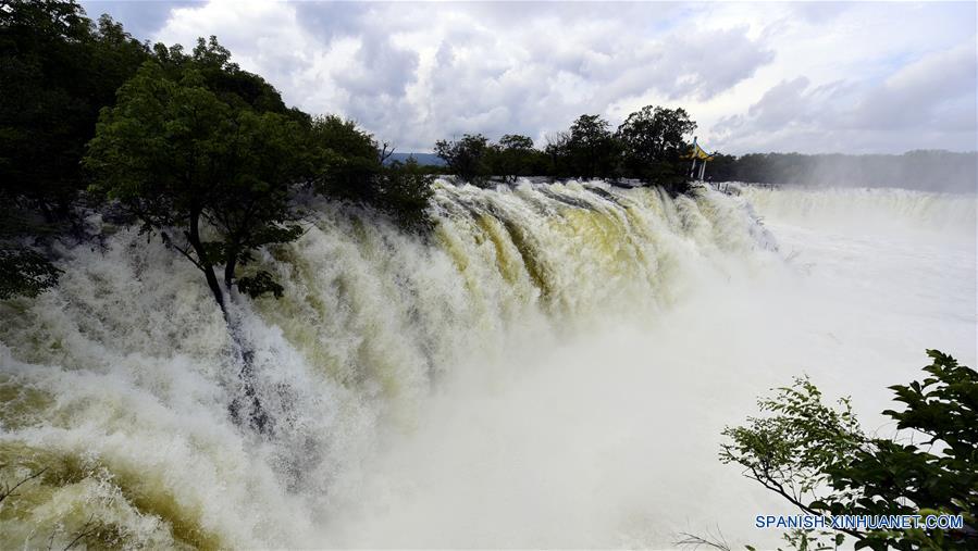Vista de la Cascada Diaoshuilou en el área escénica del lago Jingpo, en Mudanjiang, provincia de Heilongjiang, en el noreste de China, el 28 de agosto de 2018. El espléndido paisaje de la Cascada Diaoshuilou atrae a muchos turistas. (Xinhua/Zhang Chunxiang)