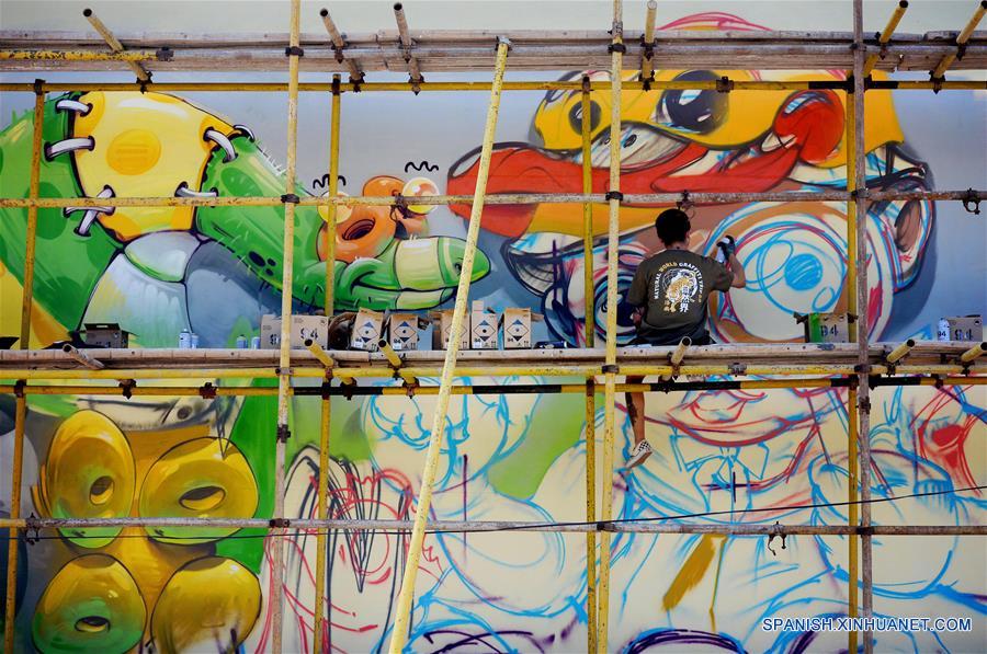 Imagen del 28 de agosto de 2018 de un artista creando un graffiti en el área escénica de Rose Town del condado de Luonan, provincia de Shaanxi, en el noroeste de China. Cuarenta y cuatro artistas del país y el extranjero participaron en el 2 concurso internacional del graffiti de Shangluo (Luonan) de China comenzando el martes en Rose Town, el cual fue implementado por el condado de Luonan especialmente para el desarrollo cultural y el turismo. (Xinhua/Liu Xiao)