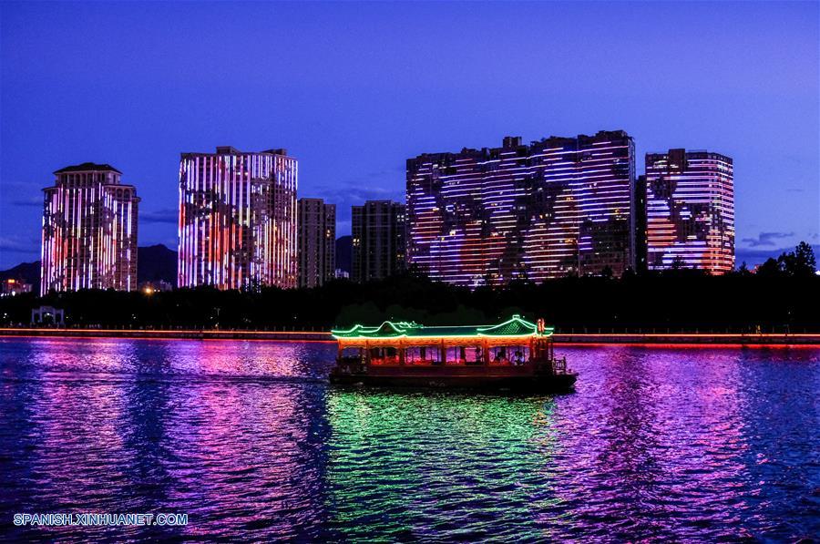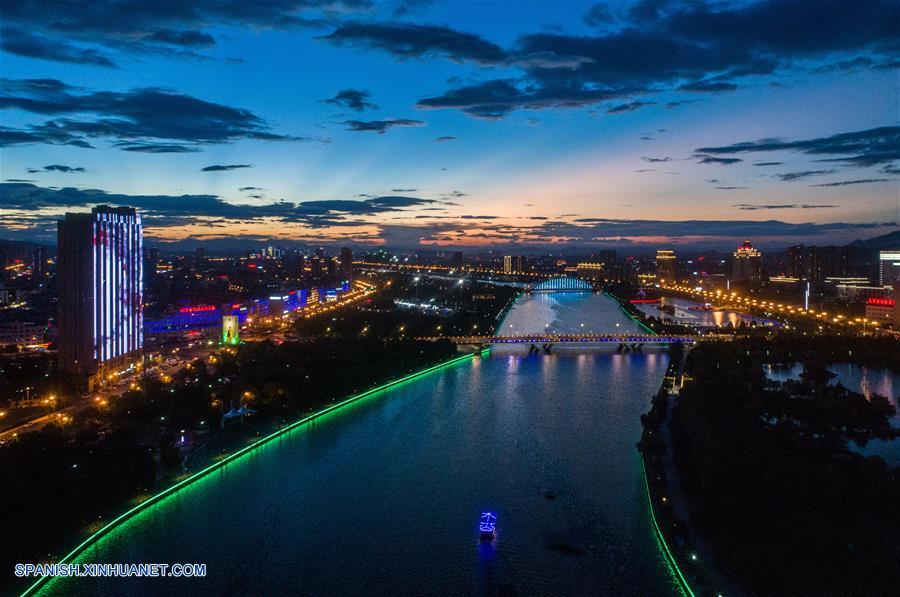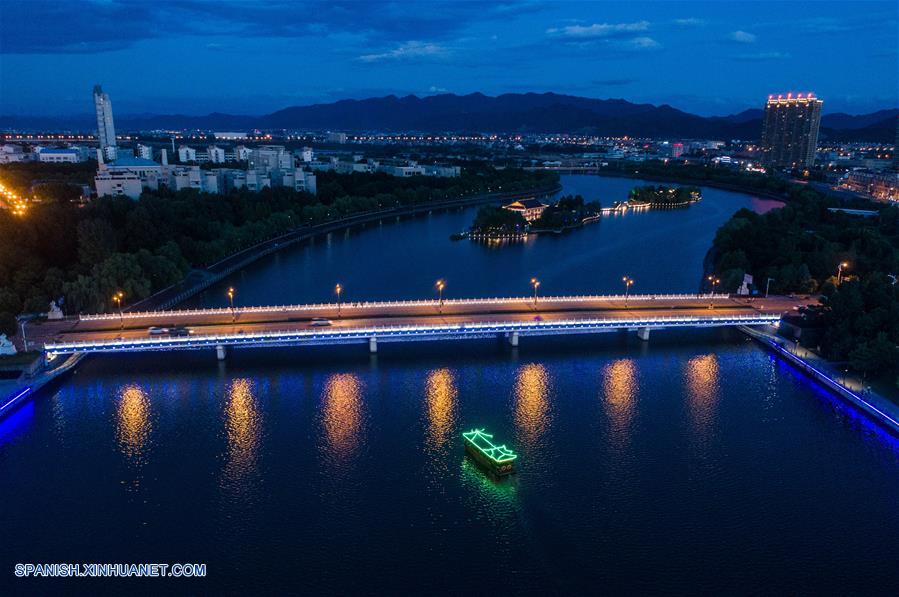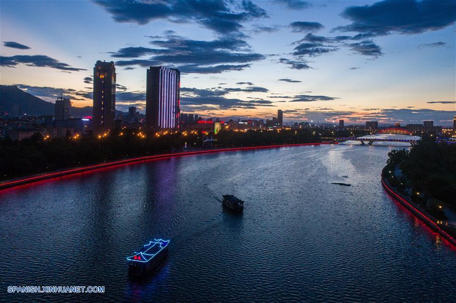 ZHEJIANG, agosto 29, 2018 (Xinhua) -- Vista de las instalaciones de luz nocturna a lo largo de la orilla del Río Dongyang, en la ciudad de Dongyang, provincia de Zhejiang, en el este de China, el 29 de agosto de 2018. El sistema de iluminación nocturna para el recorrido turístico nocturno de la ciudad ha comenzado a operar. (Xinhua/Xu Yu)