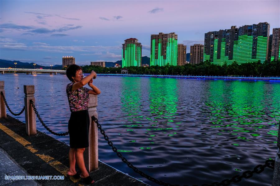ZHEJIANG, agosto 29, 2018 (Xinhua) -- Una mujer toma fotografías a la orilla del Río Dongyang, en la ciudad de Dongyang, provincia de Zhejiang, en el este de China, el 29 de agosto de 2018. El sistema de iluminación nocturna para el recorrido turístico nocturno de la ciudad ha comenzado a operar. (Xinhua/Xu Yu)