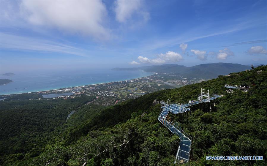 Imagen del 31 de agosto de 2018 de turistas visitando la pasarela de cristal con vista al mar construida en el Parque Forestal Paraíso Tropical de la Bahía de Yanlong, en Sanya, provincia de Hainan, en el sur de China. La pasarela de cristal con vista al mar de 400 metros de largo fue abierta al público recientemente. (Xinhua/Guo Cheng)