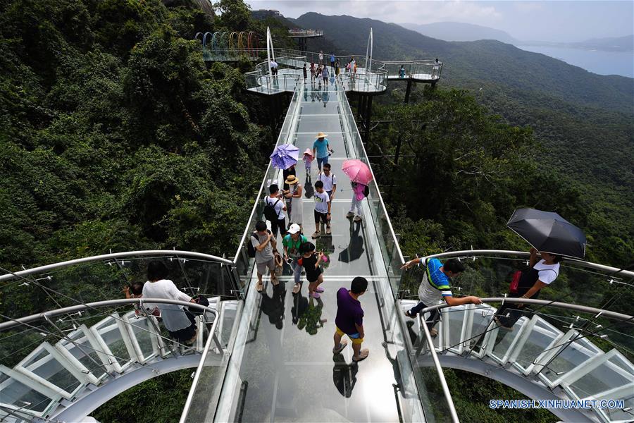 HAINAN, septiembre 1, 2018 (Xinhua) -- Imagen del 31 de agosto de 2018 de turistas visitando la pasarela de cristal con vista al mar construida en el Parque Forestal Paraíso Tropical de la Bahía de Yanlong, en Sanya, provincia de Hainan, en el sur de China. La pasarela de cristal con vista al mar de 400 metros de largo fue abierta al público recientemente. (Xinhua/Guo Cheng)