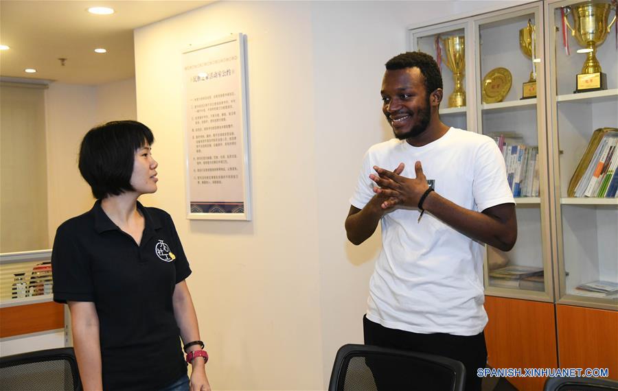 Imagen del 29 de agosto de 2018 del estudiante africano Kabey Heritier Lweny (d) y una compa?era voluntaria conversando acerca de sus canciones chinas favoritas, en Guangzhou, provincia de Guangdong, en el sur de China. Kabey, proveniente de la República Democrática del Congo, llegó a la Universidad de Tecnología de Guangdong como estudiante de idioma chino hace aproximadamente un a?o. La rica cocina y cultura chinas siempre le han atraído, pero es participar en varias actividades de voluntariado lo que le ha hecho involucrarse más en la vida de Guangzhou. "Empecé a aprender más sobre las tradiciones y estilos de vida chinos cuando me uní a los voluntarios chinos en sus servicios comunitarios", dijo Kabey. Para él, el voluntariado ofrece una manera más directa de sentir cómo es China, mientras la universidad solo ense?a vocabulario y gramática. Solo en la comunidad de Dengfeng de Guangzhou, más de 30 expatriados extranjeros se han registrado como voluntarios en los últimos tres a?os. De acuerdo con Kabey, las actividades de voluntariado pueden servir como plataformas efectivas para ayudar a los jóvenes africanos que desean conocer mejor China. (Xinhua/Deng Hua)