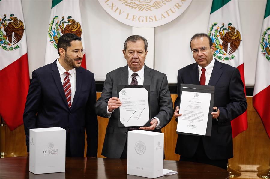 El presidente de la Cámara de Diputados, Porfirio Mu?oz Ledo (c), el presidente del Senado, Martí Batres (i) y el secretario de Gobernación, Alfonso Navarrete (d), reaccionan durante la entrega formal del Sexto Informe de Gobierno del presidente mexicano Enrique Pe?a Nieto, llevado a cabo en el Congreso de la Unión, en la Ciudad de México, capital de México, el 1 de septiembre de 2018. De acuerdo con información de la prensa local, este es el último informe de gobierno de Pe?a Nieto, quien dará un mensaje el lunes en el Palacio Nacional. (Xinhua/Francisco Ca?edo)