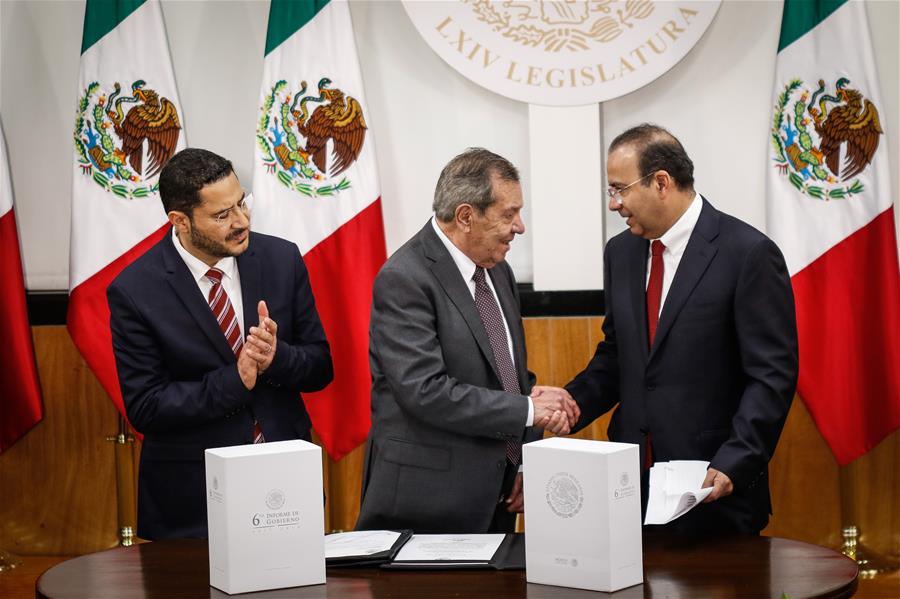 El presidente de la Cámara de Diputados, Porfirio Mu?oz Ledo (c), el presidente del Senado, Martí Batres (i) y el secretario de Gobernación, Alfonso Navarrete (d), reaccionan durante la entrega formal del Sexto Informe de Gobierno del presidente mexicano Enrique Pe?a Nieto, llevado a cabo en el Congreso de la Unión, en la Ciudad de México, capital de México, el 1 de septiembre de 2018. De acuerdo con información de la prensa local, este es el último informe de gobierno de Pe?a Nieto, quien dará un mensaje el lunes en el Palacio Nacional. (Xinhua/Francisco Ca?edo)