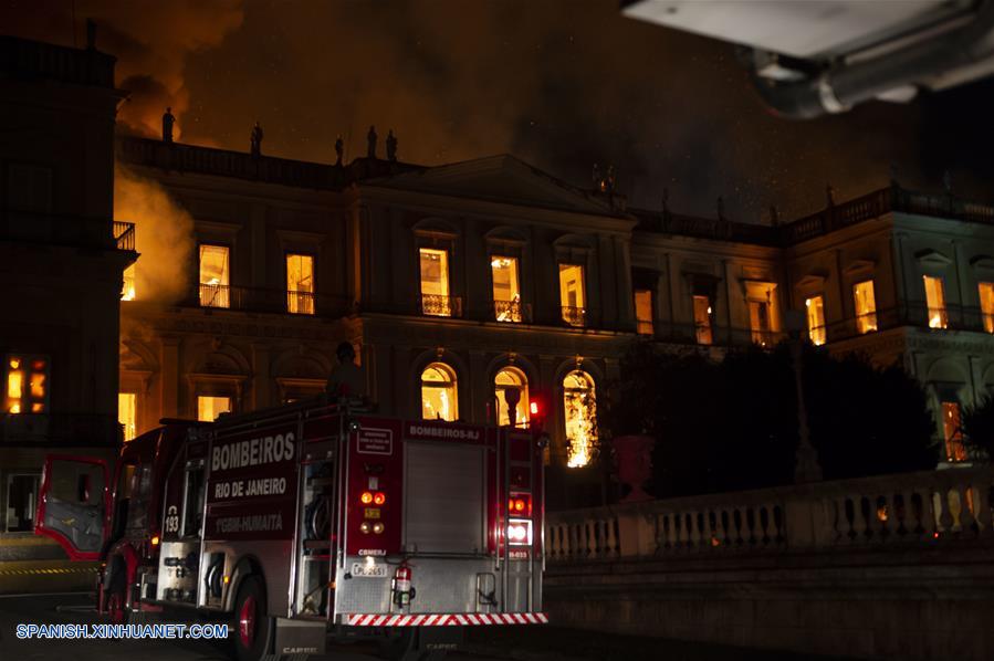 RIO DE JANEIRO, septiembre 2, 2018 (Xinhua) -- Un camión de bomberos permanece frente al Museo Nacional de Brasil, en Río de Janeiro, Brasil, el 2 de septiembre de 2018. Un enorme incendio en la noche de este domingo devora el Museo Nacional de Río de Janeiro, la más antigua institución científica de Brasil, con más de 20 millones de piezas. El fuego empezó cuando el museo ya había cerrado las puertas al público por causas por el momento desconocidas. (Xinhua/Celso Pupo/FOTOARENA/ESTADAO CONTEUDO/AGENCIA ESTADO)