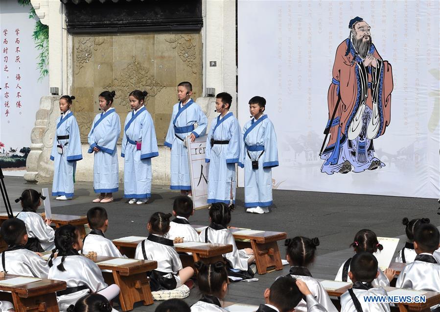 Los estudiantes de primer a?o asisten a la ceremonia inicial de escritura, una actividad educativa de la cultura tradicional china, Nanjing, capital de Jiangsu, 2 de septiembre del 2018. (Foto: Xinhua/ Sun Can)