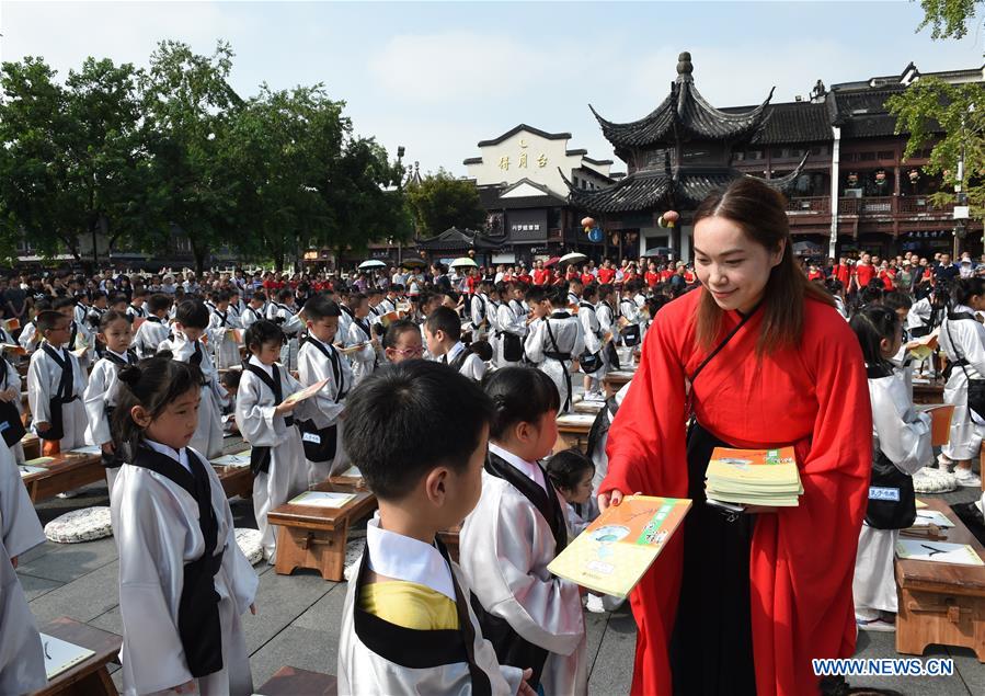 Los estudiantes de primer a?o asisten a la ceremonia inicial de escritura, una actividad educativa de la cultura tradicional china, Nanjing, capital de Jiangsu, 2 de septiembre del 2018. (Foto: Xinhua/ Sun Can)