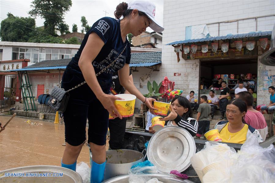 YUNNAN, septiembre 3, 2018 (Xinhua) -- Personas reciben comida traída por rescatistas en el municipio de Mengdong golpeado por inundaciones, en el condado Malipo de la Prefectura Autónoma Zhuang y Miao de Wenshan, provincia de Yunnan, en el suroeste de China, el 3 de septiembre de 2018. Las fuertes lluvias que golpearon el municipio de Mengdong el domingo provocaron inundaciones y deslaves, que dejaron cinco personas muertas y otras 15 desaparecidas. (Xinhua/Hu Chao)